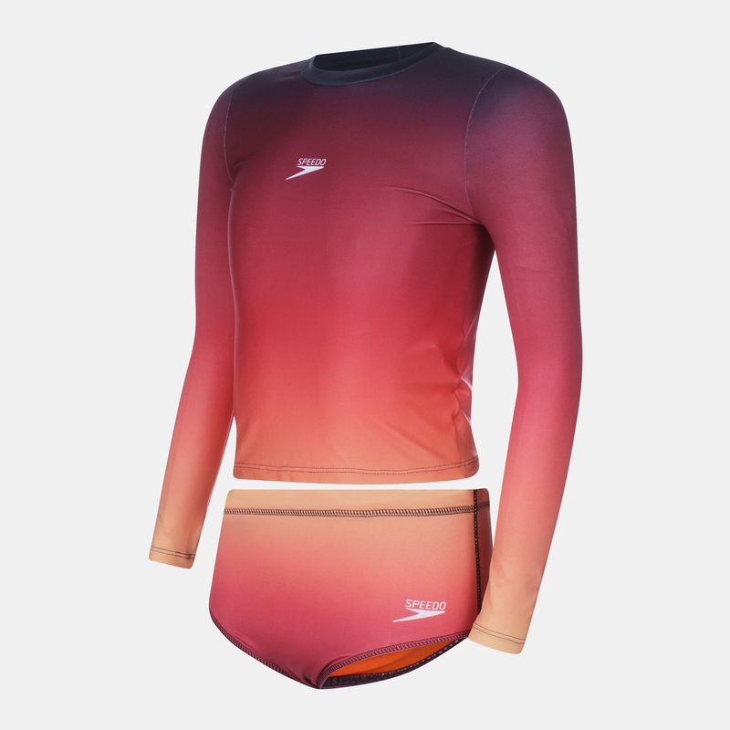 O Conjunto Trunk Degradê SPEEDO da Linha KidSplash vem com estampa degradê para enfeitar os pequenos peixinhos. É composto por camiseta de manga longa e sunga com forro, ambas as peças com proteção UV.