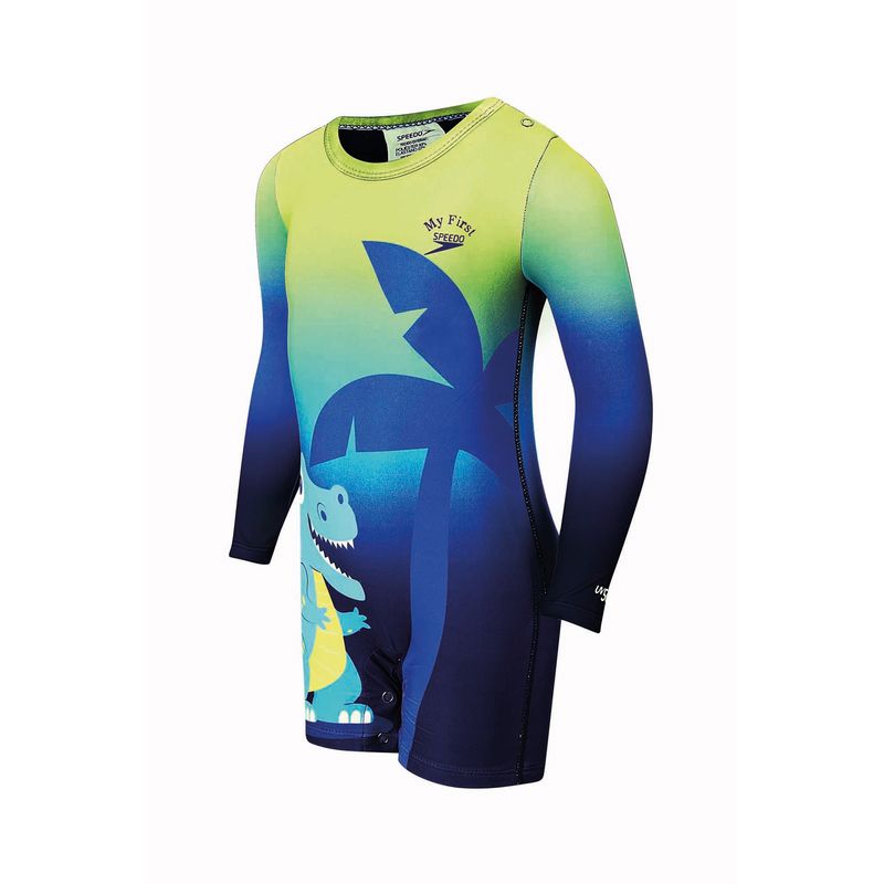 O Macaquinho Manga Longa Dino é feito para proteger o seu pequeno. Construido em poliéster e elastano, tem proteção UV 50+. Possui uma linda estampa degradê de Dinossauro e botão de pressão nas pernas. Além de forro e touquinha.