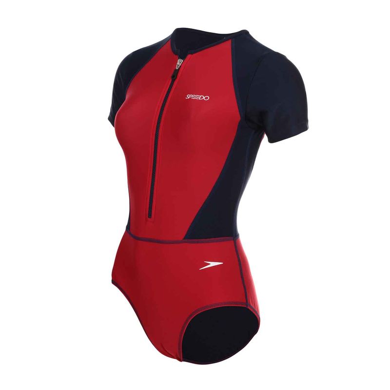 O Maiô Manga Curta Life Saver 2 Speedo é uma releitura do sucesso exclusivo das Speedo Stores. Sua modelagem é fechada na frente e nas costas, possui zíper frontal até a altura do umbigo e combinação de cores marinho e chic red em Lycra Xtralife, de maior durabilidade e resistência ao cloro das piscinas, que alongam a silhueta. Indicado para quem busca durabilidade, conforto e segurança em atividades aquáticas.